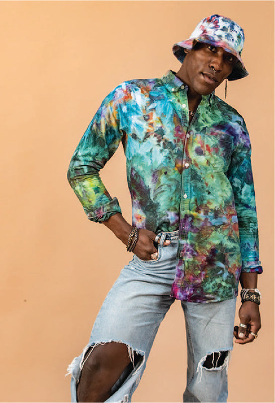 We hand-dye each piece with professional-grade fiber-reactive procion dyes, so that the fear of a piece bleeding on your other garments in the laundry is a thing of the past.